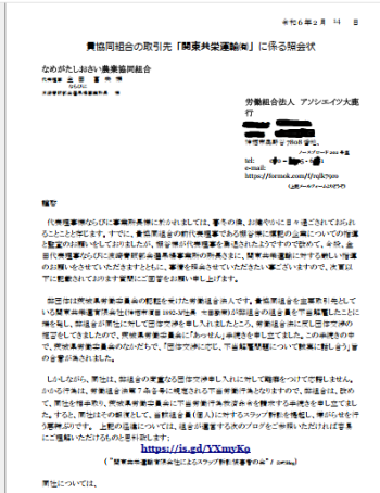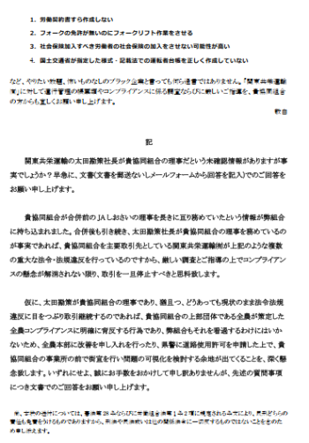 すでに、農業協同組合JAなめがたしおさいには代表理事の方宛に関東共栄運輸㈲への指導の要請を行っておりましたが、当該代表理事であった方が勇退されているとの匿名の情報を弊労働組合にいただきました。